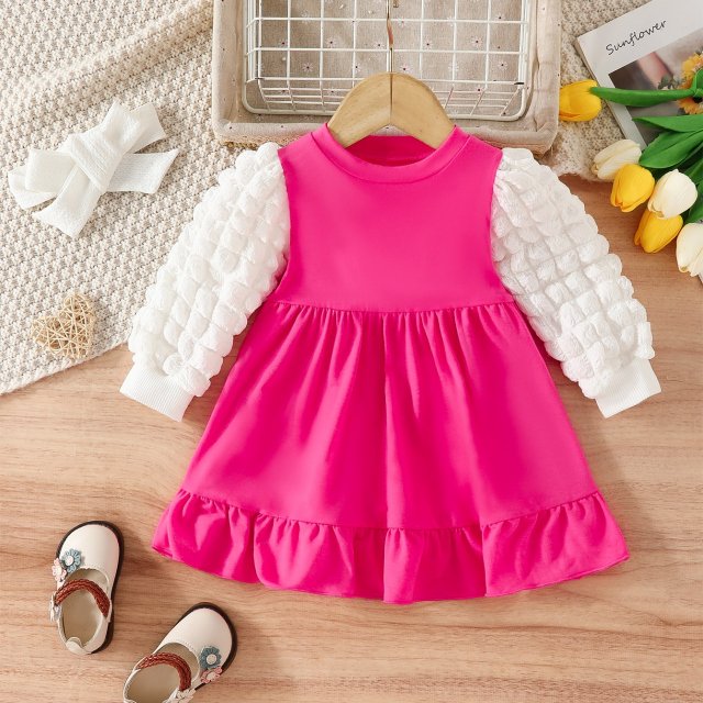 Featuring a classic round neckline and lantern-style long sleeves, this dress offers a blend of casual elegance and playful cuteness. The A-line silhouette and ruched detailing give it a gentle, flowy look that flatters your little one’s shape while keeping her comfortable all day long. Its color-block pattern adds a trendy touch that makes it stand out in any baby wardrobe. Whether it’s for a casual stroll, a family gathering, or a sweet photo shoot, this dress brings style to every moment.