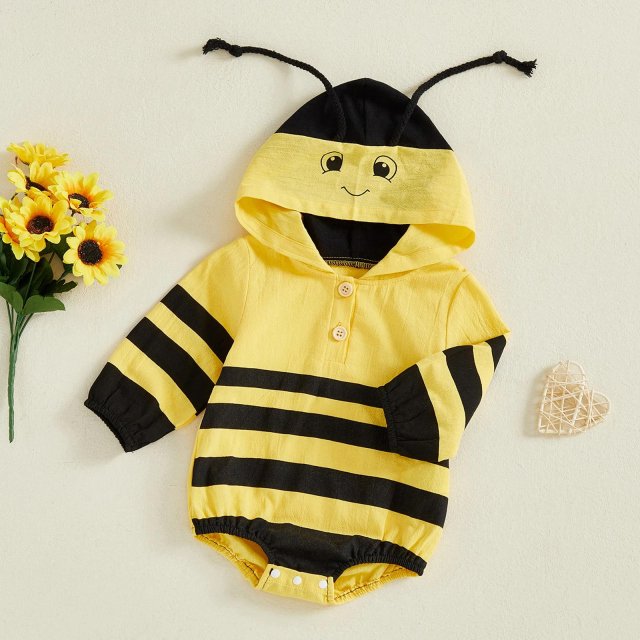 Turn your little one into the sweetest buzz in the room with this adorable baby bee hooded romper. Designed in cheerful black and yellow stripes, this soft, cozy outfit keeps your baby comfortable while making them irresistibly cute. Whether it’s for daily wear, parties, Halloween, or adorable photo sessions, this romper brings joy and comfort all in one. The loose fit makes it easy for your infant to move, crawl, and play freely while staying warm and snug.