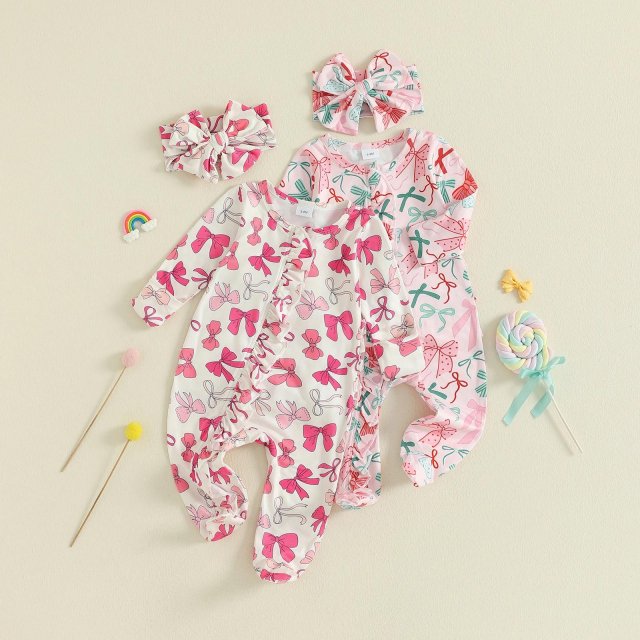 Baby Girl Bow Print Footed Romper with Headband