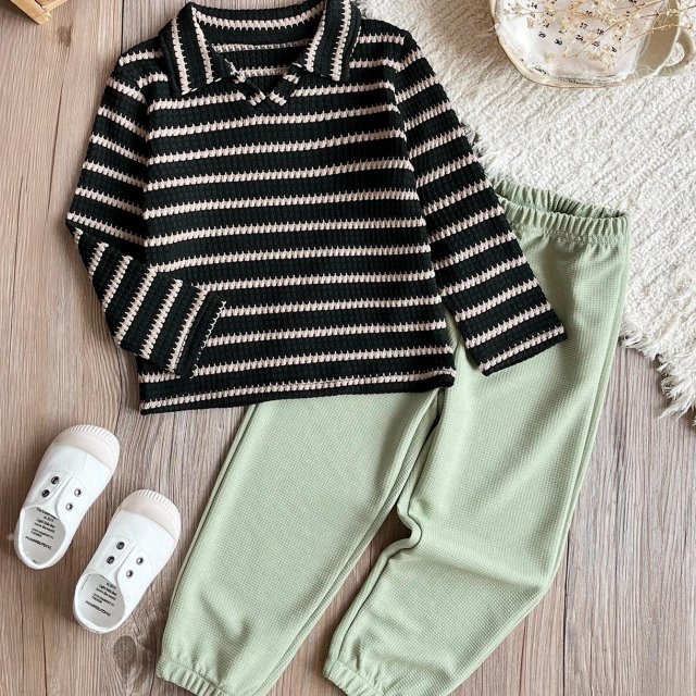 This outfit stands out for its fresh, simple charm. The striped V-neck shirt adds a classic touch, while the textured waffle-check pants give the look a modern twist. Whether worn to school, family outings, playdates, or casual weekends, it offers effortless style without sacrificing comfort. The breathable, flexible material makes it perfect for active kids in the mild temperatures.