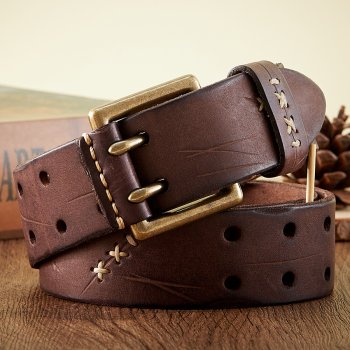 Men’s Genuine Leather Belt with Solid Brass Double Pin Buckle – Vintage 1.5 Inch Strap