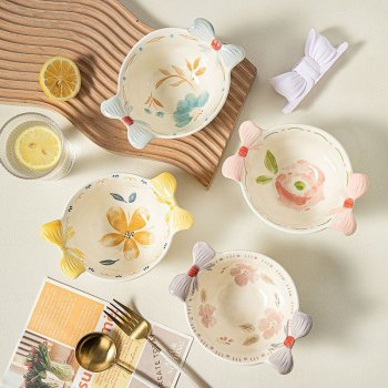 Cream Floral Ceramic Double Ear Bowl – Hand-Painted Heat-Resistant Porcelain