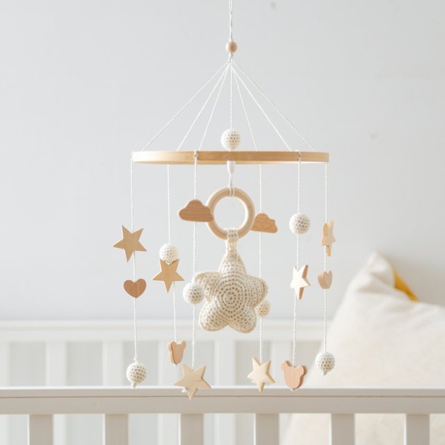 Create a soothing, magical space for your little one with this charming Wooden Baby Crib Mobile with Crochet Stars & Musical Rattle Toys. Designed to calm, entertain, and support early development, this soft and stylish mobile brings peaceful motion and comforting sounds to your baby’s crib. Its wooden and crochet elements add a warm, natural touch that fits beautifully into any nursery decor.